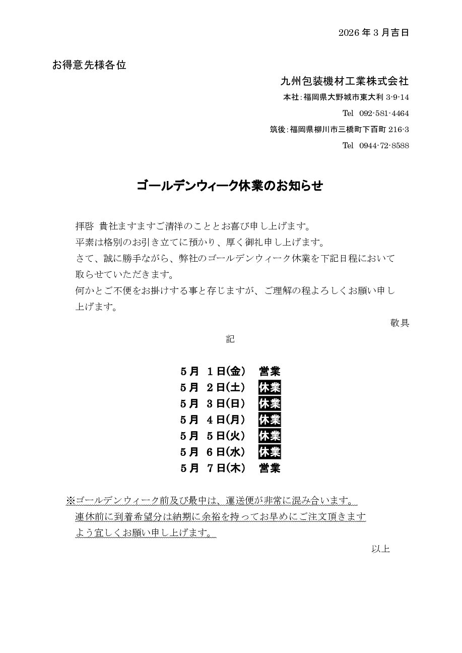 弊社のゴールデンウィーク期間の休業につきまして、案内させていただきます。